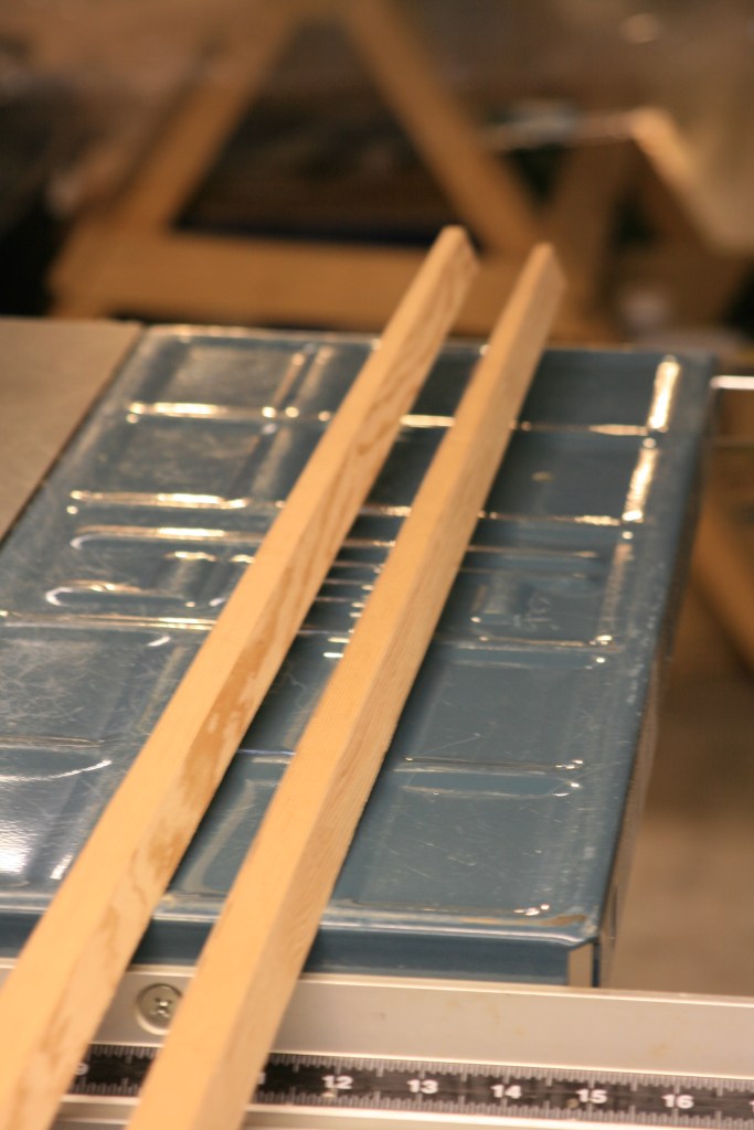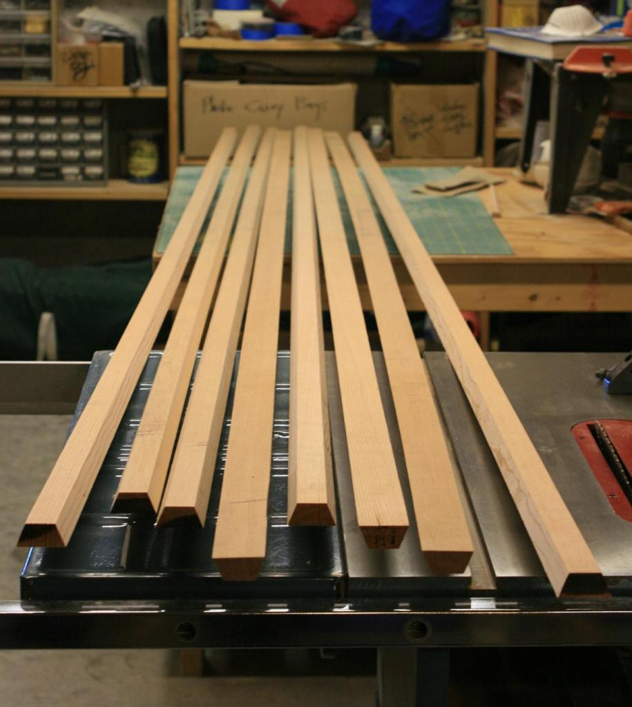 The gaff will be constructed like a long barrel, made of eight staves. The staves are ripped from Douglas fir planks using a table saw with the blade set at 22.5 degrees from vertical, and thus each stave joins at 45 degrees (8X45=360 degrees). Also each stave must be tapered at one end so the gaff will be tapered toward the peak.