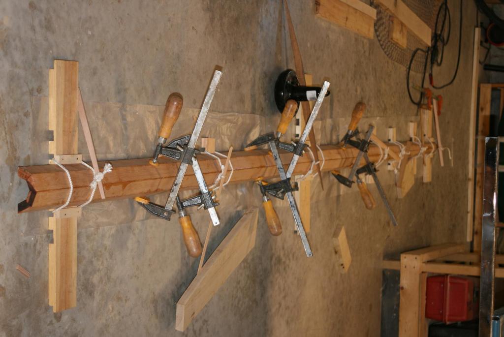 The rig for my boat Ruth Avery was built by the previous owner. I have since modified her very high peaked gaff mainsail to a more conventionally peaked gaff, around 40 degrees from the vertical. She also originally had a solid gaff made of Douglas fir which weighed a little over 40lbs., which is a fair bit of weight to have high aloft, especially in light winds when the sail begins to slat. So I will build a hollow gaff which will weigh a little less than half the original.
